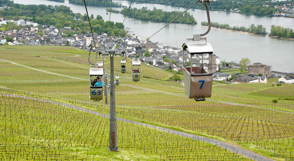 Die Seilbahn führt vom Touristenort Rüdesheim über Weinberge hinauf zum Niederwalddenkmal, dessen erhöhter Standort einen Blick auf das Rheintal ermöglicht. Die Passagiere sitzen in halboffenen Metallgondeln, die zwei Erwachsenen und zwei Kindern Platz bieten.
