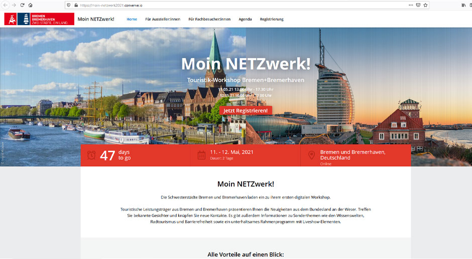 Auf einem eigens eingerichteten Portal treffen am 11. und 12 Mai 2021 Reiseveranstalter und Leistungsträger aus Bremen und Bremerhaven auf der digitalen Einkaufsmesse „Moin Netzwerk!“ aufeinander. Der Online-Workshop ist kostenfrei und bietet ein einfaches Termintool für Teilnehmer und ihre Wunschgesprächspartner sowie virtuelle Themencafés für Smalltalk oder Themenrunden. In insgesamt drei Terminblocks – verteilt über zwei Tage – besteht die Möglichkeit, mit bis zu 18 verschiedenen Kunden zu sprechen und sich über Bremen und Bremerhaven zu informieren.