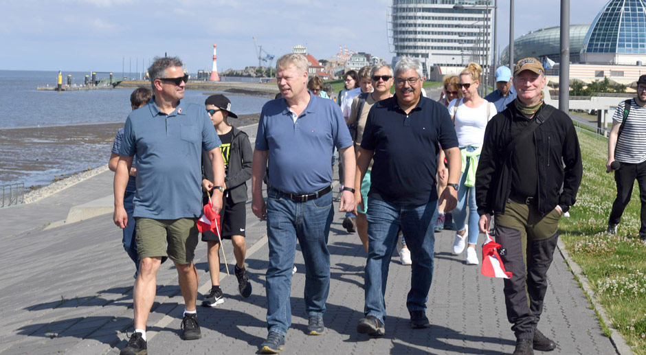 Neben Manuel Andrack war auch Oberbürgermeister Melf Grantz bei der Einweihung, der sich über das neueste Aktivangebot der Seestadt freut: „Mit dem Wanderweg, der von den touristisch relevanten Havenwelten über den Standort der Marineoperationsschule (MOS) bis in das Schaufenster Fischereihafen und wieder zurück führt, schließen wir für das Bundesland Bremen eine Lücke im Kreis der Wanderwege Deutschlands.“