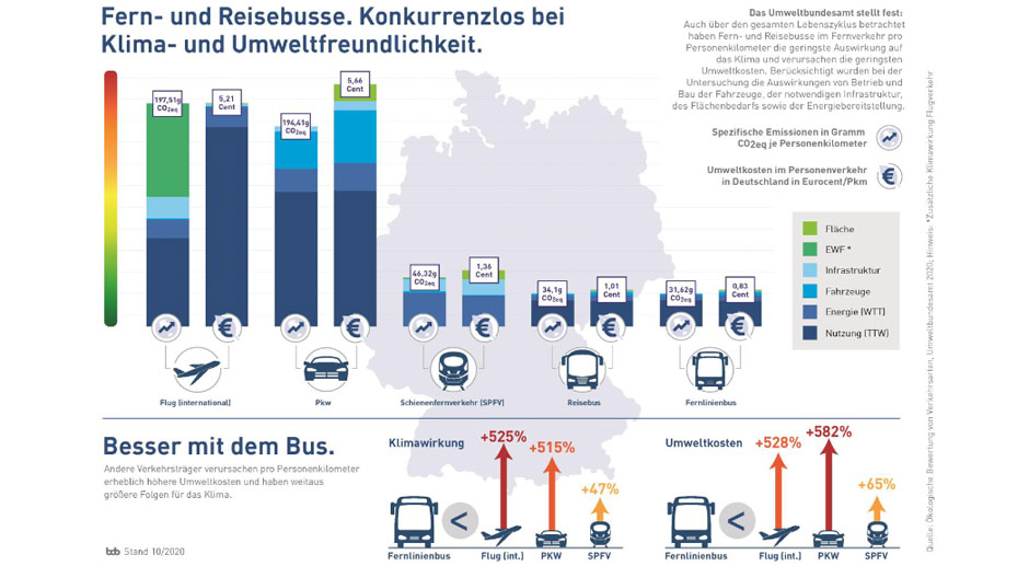 Das UBA hat ermittelt, dass Busse über den gesamten Lebenszyklus betrachtet lediglich 31,6 Gramm (Fernlinienbus) bzw. 34,1 Gramm (Reisebus) CO2 pro Personenkilometer ausstoßen, teilte der Bundesverband Deutscher Omnibusunternehmer (BDO) mit. Damit liegen die Fahrzeuge noch unter dem Wert von 46,3 Gramm für den Schienenfernverkehr. Ein Pkw erreicht über den gesamten Lebenszyklus 194,4 Gramm und ein Flieger 197,5 Gramm. Flieger und Pkw haben damit eine über 500 Prozent höhere Klimawirkung. Auch der Schienenpersonenfernverkehr liegt immer noch fast 50 Prozent höher. Ein weiteres Ergebnis des UBA: Kein Fernreiseverkehrsmittel verursacht geringere Umweltkosten als der Bus.