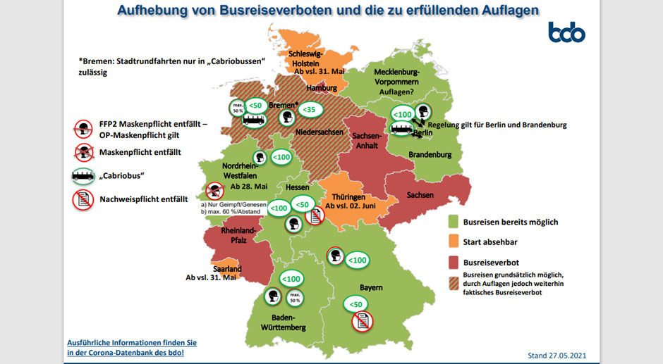 Nachdrücklich appelliert der BDO vor dem Hintergrund eines erneuten Flickenteppichs mit vielen verschiedenen Regelungen in den 16 Bundesländern, eine bundesweit einheitliche Regelung für die Branche zu schaffen. Nur so sei ein echter Restart möglich – andernfalls würden bürokratische Hürden, ein massiver Organisationsaufwand und die Verunsicherung der Kunden die Durchführung von Fahrten praktisch unmöglich machen.