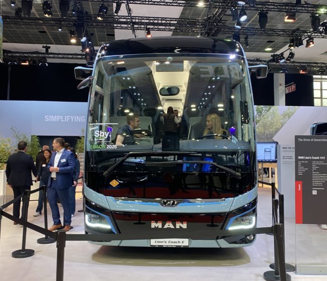 Mit dem neuen Lion’s Coach E präsentierte MAN im Mai als erster europäischer Hersteller einen vollelektrischen Reisebus. Seine Weltpremiere mit neuem Design feierte er nun auf der Busworld in Brüssel. Das Unternehmen sieht das Fahrzeug als Bekenntnis zu seiner Zero-Emission-Strategie. Der Lion’s Coach E verfügt über eine nutzbare Energiekapazität von 320 bis 480 kWh und soll unter optimalen Bedingungen Reichweiten von bis zu 650 Kilometern erzielen. Zudem bietet er Platz für bis zu 63 Fahrgäste – ohne Einschränkungen beim Gepäckvolumen im Vergleich zur Dieselvariante.