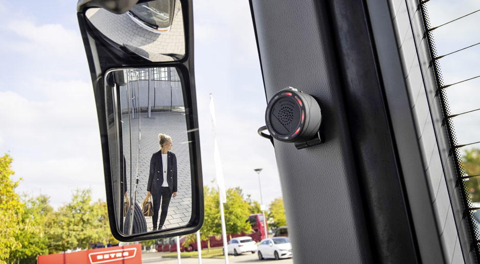 Bis zu einer Geschwindigkeit von 30 km/h ist der nachrüstbare Abbiege-Assistent, der mehrstufig arbeitet, wirksam. Im Bruchteil einer Sekunde wird der Fahrer optisch informiert, sobald sich ein bewegliches Objekt in der seitlichen Überwachungszone befindet. An der A-Säule auf der Türseite leuchtet dann eine LED in Blickhöhe gelb auf. Intuitiv lenkt diese die Aufmerksamkeit des Busfahrers auf die Situation neben seinem Fahrzeug. Ist in diesem Moment auch der Blinker nach rechts gesetzt, leuchtet die LED in roter Farbe auf und es erfolgt zusätzlich ein Warnton.