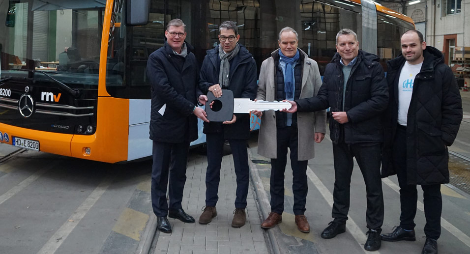 Die feierliche Übergabe der ersten drei Fahrzeuge des Typs Mercedes-Benz eCitaro G fuel cell war am 23. November 2023 auf dem Gelände des Betriebshofs der rnv in Heidelberg im Beisein von Andre Baumann, Staatssekretär im Ministerium für Umwelt, Klima und Energiewirtschaft des Landes Baden-Württemberg, erfolgt. Till Oberwörder, CEO von Daimler Buses, händigte die symbolischen Schlüssel der drei Premierenfahrzeuge an Martin in der Beek, Technischer Geschäftsführer der Rhein-Neckar-Verkehr GmbH, sowie Eckart Würzner, Oberbürgermeister der Stadt Heidelberg, aus.