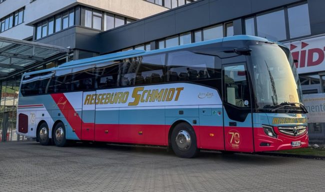 Den Bus ziert sogar Josef Schmidts Unterschrift. Das 70‑jährige Bestehen sei bedeutender Meilenstein für das traditionsreiche Touristikunternehmen aus Norddeutschland, das Josef Schmidt am 7. März 1956 aus der Taufe hob.Der eigens gestaltete Retroliner soll “ein sichtbares Symbol für die Verbundenheit mit der Unternehmensgeschichte” zum Ausdruck bringen. Mit seinem klassischen Design, das nostalgische Elemente der frühen Unternehmensjahre aufgreife, erinnere das Fahrzeug an die Wurzeln des Familienbetriebs und verbindet diese mit dem modernen Anspruch des heutigen Unternehmens. „Der Retroliner ‚Josef‘ ist eine Hommage an meinen Großvater”, sagt der heutige Geschäftsführer Georg Wilhelm Schmidt. Der Name Josef Schmidt stehe für die Werte, “die unser Unternehmen seit 70 Jahren tragen: Verlässlichkeit, Herz und der Mut, Neues zu wagen”. Seine Jungfernfahrt führte den Jubiläumsbus in die Alpen, wo er Gäste aus dem Ski-Urlaub abholte, darunter eine Schulklasse. „Damit handelte es sich zwar nicht um eine klassische Jubiläumstour. Dennoch bot diese Fahrt einen stimmungsvollen Rahmen für den ersten offiziellen Einsatz des Retroliners ‘Josef’”, heißt es aus dem Unternehmen.