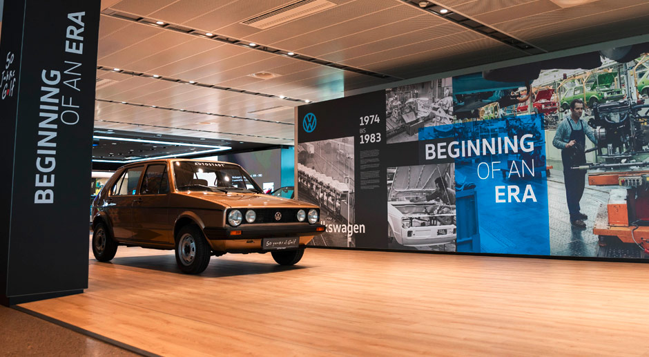 Entsprechend erstrecken sich die angesprochenen sechs Themenbereichen der Golf-Sonderausstellung auf sämtliche Aspekte der Fahrzeuggeschichte. Im ersten Ausstellungsbereich „Anfänge“ werden die Besucher zurück in die 1970er Jahre geführt und bekommen einen Golf der ersten Generation aus der Zeit Haus-Sammlung zu sehen. Wandgrafiken mit Tapeten im Stil der 1970er Jahre rufen Ereignisse in Erinnerung, die in dieser Zeit prägend waren: darunter die Fußball-Weltmeisterschaft oder der Amtsantritt von Helmut Schmidt als Bundeskanzler. In einer Vitrine ist außerdem die erste Zeichnung des Golf von Designer Giorgetto Giugiaro zu sehen.