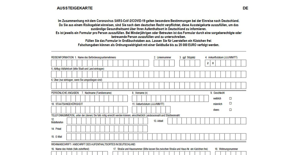 Bei der „Digitalen Aussteigekarte“ handelt es sich im Kern um die digitale Bereitstellung von Reisedaten sowie deren sichere Übermittlung an die zuständigen Stellen. Mithilfe dieser Reisedaten, die an die lokalen Gesundheitsbehörden übermittelt werden, sollen verpflichtende Quarantänemaßnahmen für Einreisende aus Risikogebieten wirksam überwacht werden können.
