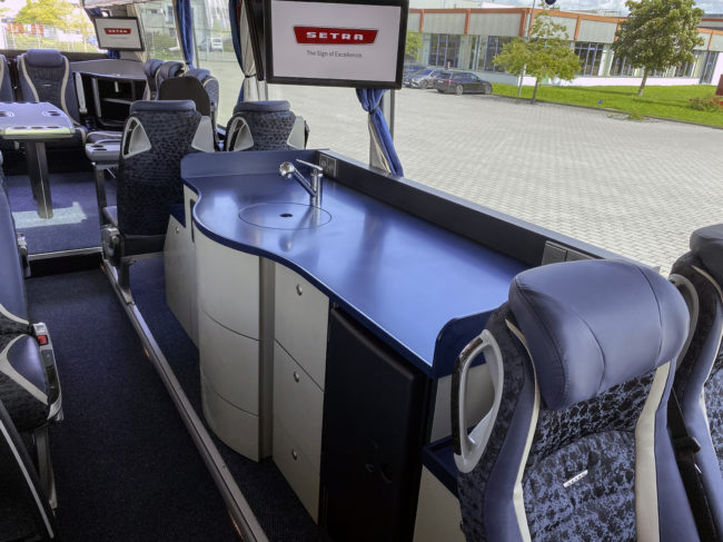 Die Passagiere können es sich in dem Fahrzeug, das am Neu-Ulmer Produktionsstandort von Daimler Buses im Bereich „Kundensonderwunsch-Manufaktur“ ausgerüstet wurde, unter anderem auf acht Sitzen in einer Clubecke mit Konferenztisch sowie an zwei weiteren Tischen im vorderen Teil des Busses bequem machen.