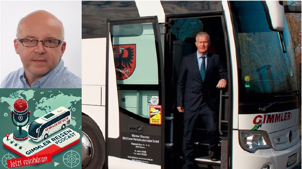 Timbre“, findet Manfred Thielmann. Jede Folge wird mit einer eigenen Melodie zur Wiedererkennung „eingeläutet“, dann folgt eine kurze Anmoderation und anschließend das Gespräch. „Für die ersten fünf Podcasts haben wir einen unserer Ruheständler engagiert, Dieter Roser. Dabei war uns wichtig, dass die ‚Chemie‘ zwischen ihm und der Moderatorin stimmt.“ Tatsächlich kommen die beiden im „Duett“ ausgesprochen sympathisch durch den Äther. „Roser ist 40 Jahre lang für ‚Gimmler Reisen‘ Bus gefahren, durch ganz Europa. Ursprünglich wollte er gar nicht im Beruf bleiben“, berichtet Jens Bautz. „In einem der Podcasts erzählt er das sogar. Er wollte Europa bereisen und dann wieder etwas anderes machen. Er hatte nur nicht damit gerechnet, ‚süchtig‘ nach Busfahren und Reisen zu werden, wie er es ausdrückt. Mit seiner eigenen Begeisterung für die Destinationen, über die er spricht, macht er Lust auf unsere Reisen.“