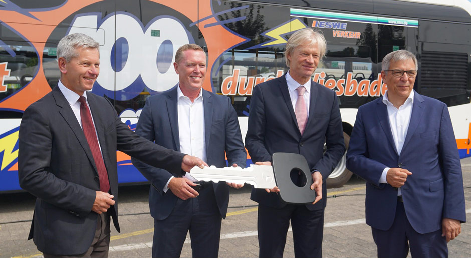 Damit gehört ESWE Verkehr zu den ersten Verkehrsunternehmen in Deutschland, die über eine solch große Flotte an batterieelektrischen Solo-Bussen verfügen. Der symbolische Schlüssel wurde vom Hersteller Daimler Buses an Wiesbadens Oberbürgermeister Gert-Uwe Mende, Verkehrsdezernent Andreas Kowol und ESWE-Verkehr-Geschäftsführer Jan Görnemann überreicht.