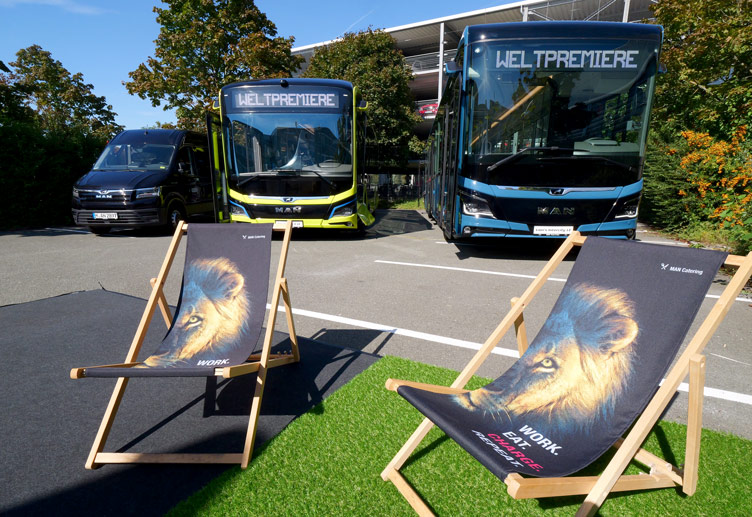 Auch in Sachen eBus-Portfolio gibt es neben neuen Batterien (ab 2025) und neuer ZF Elektroachse (ab 2024) weitere spannende Neuerungen: So bringt MAN in diesem Jahr als weitere eBus-Lösung den Lion’s City 12 E LE (Aufmacherfoto oben Mitte) auf den Markt, der erste Überland-Wagen der Löwenmarke in einem bisher sehr spärlich besetzten Segment. Dieser basiert auf dem elektrischen 12-Meter-Solobus mit Zentralantrieb und modularen Batterien, sorgt aber mit der auf Kundenfeedback angepassten Bodenlandschaft für einen besonders hohen Sitzkomfort. Mit bis zu 41 Fahrgastsitzen plus Sondernutzungsfläche für Rollstuhl und Kinderwagen und einer motorturmfreien Hecklandschaft in Low Entry Bauweise eignet sich der Lion's City 12 E LE perfekt für Vorortlinien mit Klasse-1-Zulassung. „Insbesondere die Tatsache, dass die Sitze im hinteren Bereich des Fahrzeugs alle in Fahrtrichtung ausgerichtet sind, sorgt dafür, dass Fahrgäste selbst auf längeren Strecken komfortabel unterwegs sind“, sagt Heinz Kiess, Leiter des Produktmarketings. Der Wagen ist allerdings aufgrund der Regelungen zu den Notausstiegen im Dach derzeit noch nicht Klasse 2-zulassungsfähig.
