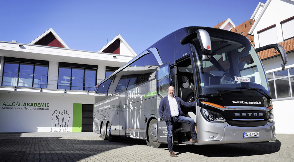 Mit einem neuen Setra Topclass S 515 HDH wird Peter Wild, Inhaber und Fahrlehrer der Allgäu Akademie Wild GmbH, seine Fahrschüler von Beginn ihrer Ausbildung an mit den aktuellen Fahrerassistenzsystemen vertraut machen. Dazu zählen unter anderem der vorausschauende Tempomat „Predictive Powertrain Control“ (PPC) mit Topografieerkennung, ein Spur- und ein Aufmerksamkeits- sowie der weltweit erste Notbremsassistent für Omnibusse. „Neben den praktischen Fahrübungen ist es wichtig, dass die angehenden Omnibusfahrer all die Systeme beherrschen lernen, die immer häufiger zum Einsatz kommen werden. Mit dem neuen Setra ist das möglich“, sagt Peter Wild.