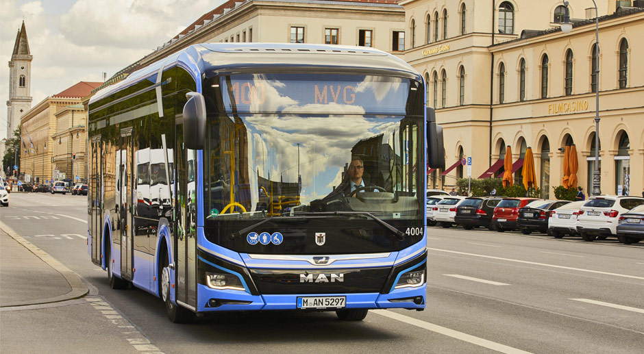In München ist der MAN Lion’s City E in der 12-Meter-Version im Einsatz. Der Dreitürer bietet Platz für bis zu 88 Passagiere. Angetrieben wird der eBus von einem Zentralmotor an der Hinterachse. Der vollelektrische Antriebsstrang leistet im Solobus 160 kW bis maximal 240 kW. Die Energie dafür stammt aus sechs Lithium-Ionen-Batteriemodulen mit 480 kWh Kapazität. Die Batterien sind auf dem Dach verbaut. Der Hersteller verspricht eine Reichweite von 200 km und bis zu 270 km unter „günstigen“ Bedingungen über die gesamte Lebensdauer der Batterien. Mit einer Ladeleistung von bis zu 150 kW könne der Bus in weniger als drei Stunden komplett geladen werden.