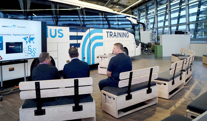 Die Schulungsräume „Bertha“, „Carl“ und „Benz“ bieten neben moderner Technik und reichlich Platz für jeweils bis zu 14 Teilnehmer auch sehr kurze Wege, um schnell von der Theorie direkt in die Praxis, sprich: an die Schulungsbusse oder in die Werkstatt, zu wechseln. Während die Räume „Berta“ und „Benz“ für intensives Arbeiten mit Trainingsmaterial an Tischen konzipiert wurden, hat das Trainingsteam den Raum „Carl“ in einer Ecke der weitläufigen Halle als großzügiges Auditorium ausgelegt. Formschöne, gemeinsam mit einer lokalen Schreinerei entwickelte Sitzelemente aus Holz reihen sich hier im Halbrund um eine Präsentationsfläche und bieten Platz für bis zu 30 Personen. Je nach Anlass und Bedarf bildet ein Stadt-, Überland- oder Reisebus von Mercedes-Benz oder Setra die passende Kulisse.