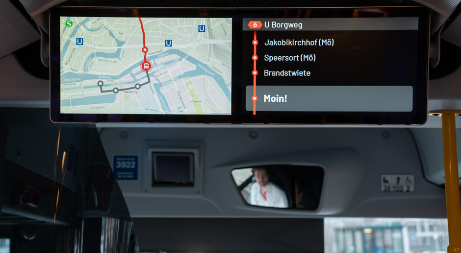 Kunden können so künftig auf der einen Hälfte das Fahrziel, die nächste Haltestelle, das Linienband mit den folgenden drei Haltestellen und die Stopp-Bestätigung sehen. Weitere Fahrgastinformationen sollen ab Sommer auf der anderen Hälfte der Monitore eingespielt werden. Der aktuelle Fahrweg auf einer Hamburg-Karte ist hier bereits zum Start der Ausrüstung zu sehen.