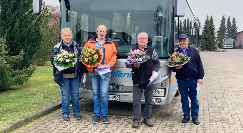 Sandro Bohm, Geschäftsführer des Omnibusbetriebs Schniering, freute sich, diese Auszeichnung, die neben dem Diplom auch aus einem Orden und einer Anstecknadel besteht, an seine Mitarbeiterin Sigrid Martens (20 Jahre) sowie seine Mitarbeiter Uwe Lückemeier (20 Jahre), Friedel Holte (über 25 Jahre) und Reinhard Friedrich (über 40 Jahre, Senior-Chef) übergeben zu können.
