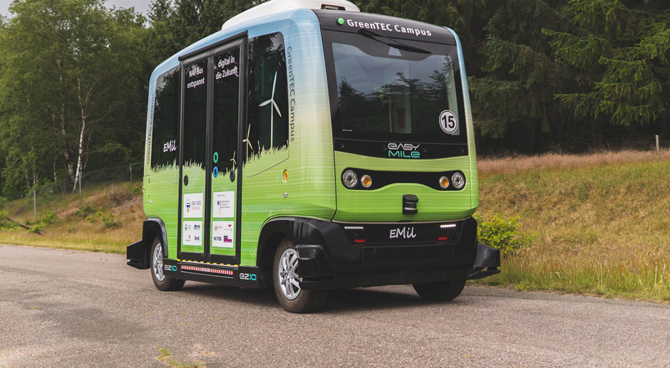 Der autonome Minibus Emil auf dem Green-TEC Campus in Enge-Sande fährt seit Oktober vollautomatisiert, also ohne Begleiter an Bord, der notfalls eingreifen kann. Er befördert Mitarbeiter und Besucher über vier Haltestellen und mit einer Höchstgeschwindigkeit von 15 km/h über das weitläufige Gelände. Das Fahrzeug orientiert sich an seiner Umgebung.