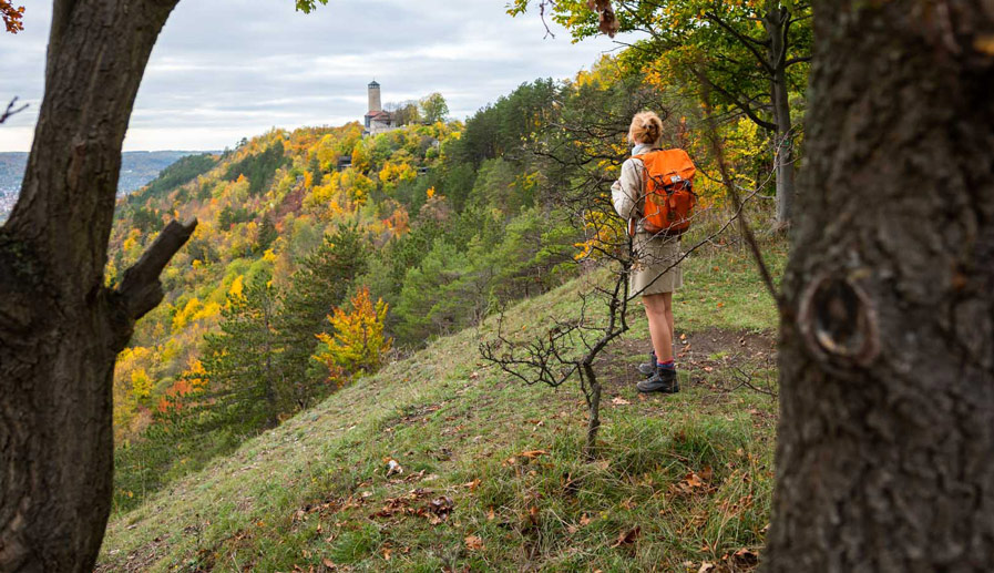 Für Bustouren könnte die Anreise zur Etappe 8 kaum einfacher sein: als Tour-Start bietet sich die Bushaltestelle Mühltal im Westen Jenas an. Von dort aus geht es steil bergan durch einen Buchenwald zum Waldlehrpfad „Schlauer Ux“. An zahlreichen Stationen können kleine wie große Entdecker mithilfe einer App Wissenswertes über den Wald und seine Bewohner erfahren. Sie begeben sich auf Spurensuche nach Waldtieren und einem Hexenhaus. Unterwegs lohnt ein Abstecher zum Restaurant Forsthaus mit Aussichtsturm. Vom Ernst-Haeckel-Stein bietet sich erneut eine beeindruckende Aussicht auf Jena. Durch das Lebetal führt die Tour wieder hinab in die Stadt.