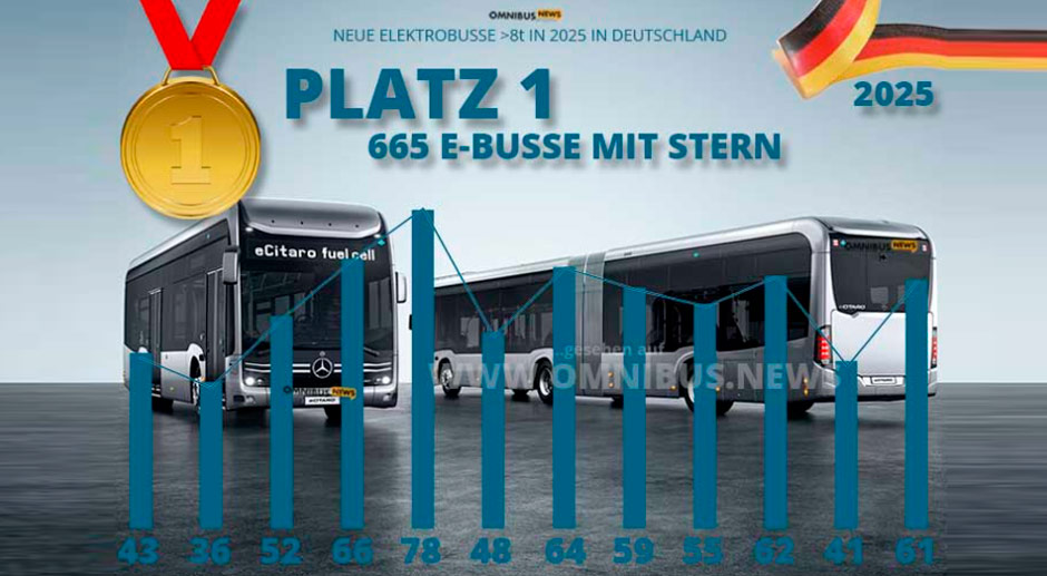 Damit steigen auch die Begehrlichkeiten internationaler Hersteller. Neu in der Statistik der Flensburger Behörde ist beispielsweise VinFast gelistet – wenn auch zunächst nur mit einem einzigen Elektrobus aus Vietnam. Dass chinesische Hersteller längst in Deutschland angekommen sind, zeigt unter anderem die Bestellung der Deutschen Bahn bei BYD. Die Marke sicherte sich 2025 mit 167 neu zugelassenen Elektrobussen den dritten Platz. Bezogen auf die Gesamtzahl von 1.458 Fahrzeugen entspricht das einem Marktanteil von rund zehn Prozent. Zur Jahresmitte dominierte Mercedes-Benz das Feld und vereinte mehr als 50 Prozent der Neuzulassungen auf sich. Zum Jahresende stehen 665 Elektrobusse zu Buche – der Stern glänzt mehr denn je.