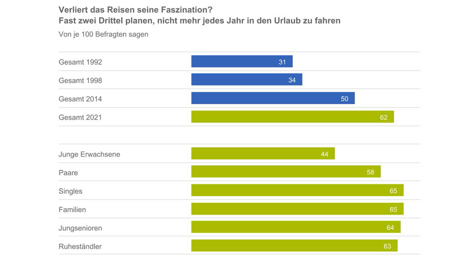 Innerhalb der Bevölkerung seien es vor allem Singles, Familien und ältere Bundesbürger, die nicht mehr jedes Jahr unterwegs sein möchten. Dagegen bleibe für die Mehrheit der 18- bis 24-Jährigen Reisen das Statussymbol.