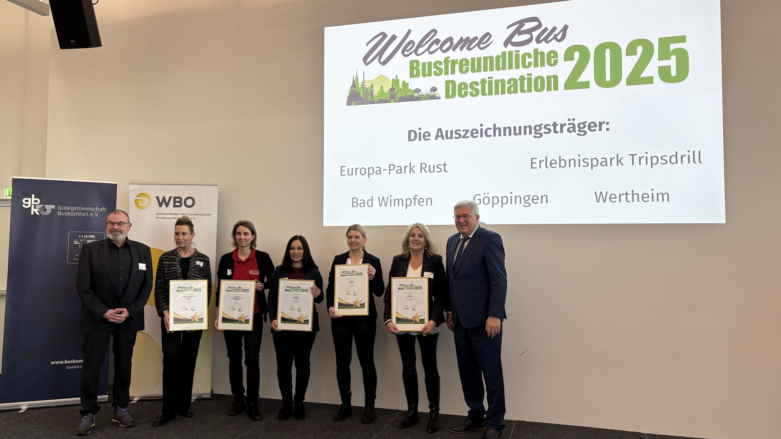 Mit der Auszeichnung würdigen die beiden Verbände Städte, Regionen sowie Unternehmen der Freizeit- und Tourismusbranche, die den Bustourismus fördern. Insgesamt wurden fünf Auszeichnungen vergeben – an drei Städte und zwei Freizeitparks. Die ausgezeichneten Städte sind Bad Wimpfen, Göppingen und Wertheim, die ausgezeichneten Freizeitparks der Europa-Park in Rust und der Erlebnispark Tripsdrill in Cleebronn.