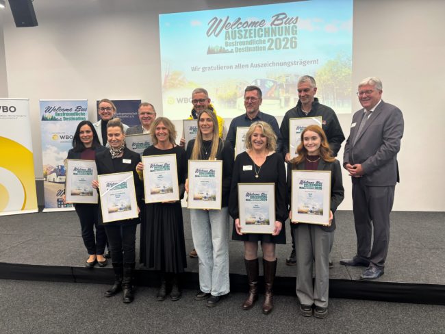 Die diesjährigen Preisträger der Auszeichnung „Welcome Bus 2026“ mit WBO-Vizepräsidentin Carolin Grötzinger (2.v.l.) und gbk-Präsident Hermann Meyering (r.) / Foto: Bus Blickpunkt