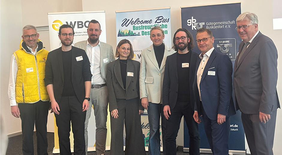 Die diesjährigen Preisträger der Auszeichnung „Welcome Bus 2026“ mit WBO-Vizepräsidentin Carolin Grötzinger (2.v.l.) und gbk-Präsident Hermann Meyering (r.) / Foto: Bus Blickpunkt