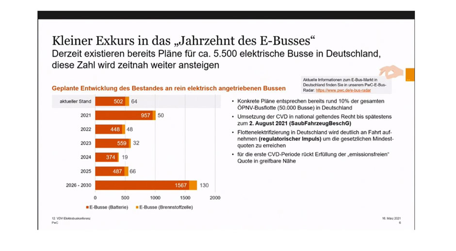 So kommt die von Pricewaterhouse Coopers (PWC) unter Mitarbeit von Intraplan Consult verfasste Studie unter anderem zu dem Schluss, dass 2030 etwa 1,8 Milliarden Euro zusätzlich in den Ausbau eines umweltfreundlichen und leistungsstarken Busverkehrs investiert werden müssen.