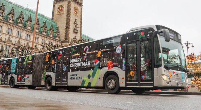 Das Fahrzeug ist nicht nur außen weihnachtlich beklebt, sondern auch und innen geschmückt. Die Haltestangen sind in Zuckerstangenoptik gestaltet, und auch ein dekorierter Weihnachtsbaum fährt mit. Daneben gibt es allerlei Details, die die Passagiere zum Entdecken einladen sollen, je nachdem, wo im Bus sie sich auf einer Fahrt befinden bzw. niederlassen. Der Weihnachtsbus von VHH Mobility und der Rindermarkthalle St. Pauli ist an allen Adventssamstagen zwischen 12 und 18 Uhr zentral in Hamburg auf der Linie 3 zwischen Stadionstraße und Rathausmarkt anzutreffen. In dieser Zeit fährt sogar ein echter Weihnachtsmann mit und verteilt Leckereien an kleine Weihnachtsfans.