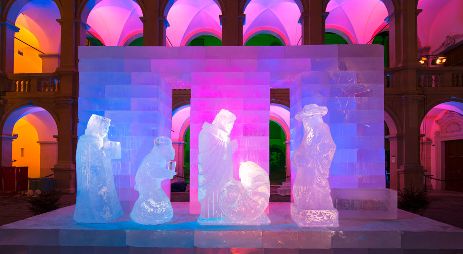 Auch in Graz wird nicht das übliche Material für eine Krippe verwendet: Statt aus Sand wie in Italien besteht die fünf Meter breite und sieben Meter hohe Krippe mit lebensgroßen Figuren in der steirischen Landeshauptstadt im Süden Österreichs aus 35 Tonnen Eis. Verantwortlich dafür ist der finnische Eiskünstler Kimmo Frosti, dessen Name so passend ist, dass das örtliche Tourismusbüro extra noch mal klarstellt: Das sei kein Künstlername. Frosti sorge auch für Ersatz, falls eine der Figuren im Laufe der Adventszeit schmelze. Die diesjährige Variante der Eiskrippe, die 1996 erstmals gestaltet wurde, ist vom 30. November bis voraussichtlich Ende Dezember im Hof des Landhauses zu sehen, einem zentral gelegenen Renaissancebau in der Stadt.