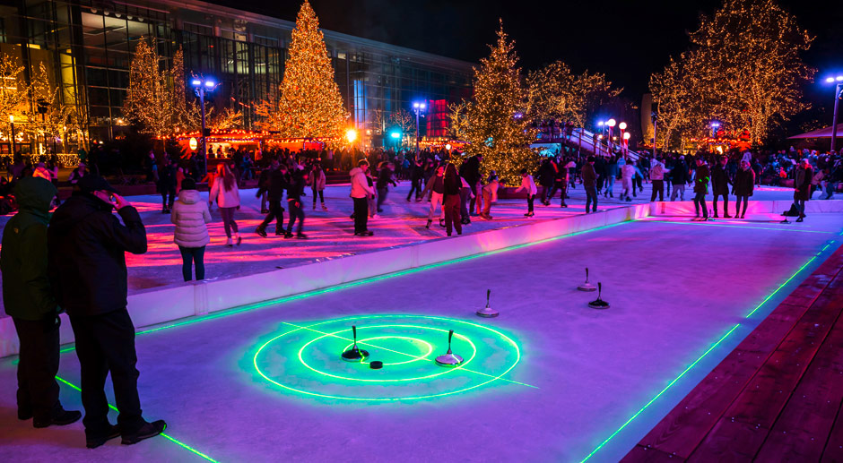 Die 4.000 Quadratmeter große Eisfläche bietet genügend Platz zum Schlittschuhlaufen. Sie ist täglich von 10:00 Uhr bis 22:00 Uhr geöffnet. Wer es lieber ruhiger mag, kann sich beim Eisstockschießen - ganz ohne Voranmeldung - ausprobieren. Sonntags bis donnerstags immer von 16.30 bis 19.30 Uhr verwandelt sich die Eisfläche in eine Outdoor-Disco mit Live-DJ und wechselnden Beats. Schlittschuhe für die Eisfläche können mitgebracht oder spontan vor Ort ausgeliehen werden.